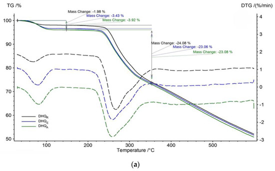 The thermal analysis clearly shows that all samples contain moisture in various amounts. The first step on thermogravimetric (TG) curves up to ca. 120 °C (Figure 6a), and broad endothermic effects on differential scanning calorimetry (DSC) curves up to 110–116 °C (Figure 6b) both indicate the removal of absorbed solvent (most probably pure water). All samples remain stable until ca. 230 °C, where further mass loss starts. According to DSC, they melt at 228.9 ± 0.4 °C followed by decomposition. The small endothermic effect at 109–116 °C we associate with eliminating crystal solvent from small impurities of DHQ hydrates [26]. At 137–148 °C, samples undergo some exothermic transformation, which is highly likely as cold crystallization of the present amorphous structure to a crystalline one. It agrees well with XRD results: initial crystallinity grows in the direction DHQE—DHQA—DHQR. The larger the amorphous fraction, the greater the DSC effect.