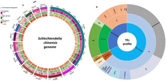 We analyzed a high-quality 344.59 Mb genome assembly of Schlechtendalia chinensis with 91.71% of the assembled sequences (315.55 Mb) anchored into 13 chromosomes. We detected a total of 308,196 TEs in the genome of Schlechtendalia chinensis using signature and homology-based strategies. The whole TEs dataset included both complete and incomplete copies and covered 89,735,022 bp, accounting for 26.04% of the total genome of S. chinensis. The full-length TEs dataset consists of 7743 elements, including LTR-RTs, non-LTR-RTs, and DNA transposons, accounting for approximately 7% of the whole genome. Among the LTR-RTs, Gypsy and Pao have a more significant number of full-length copies, while LINE has more full-length copies than non-LTR-RTs. The total number, full-length copies number, classification, and percent contribution of TEs to the whole genome were also analyzed. All the TEs identified in this study were further analyzed and located on the chromosomes, and their density in 13 chromosomes can be seen in the genome of S. chinensis (Figure 1a).