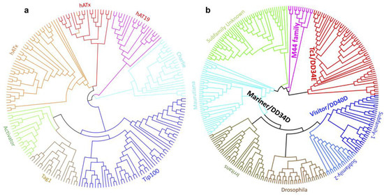 Phylogenetic classification of the two major superfamilies of Class II TEs in the genome of S. chinensis. (a) Classification of 207 full-length representative sequences from hAT superfamily, classifying them into six known families. (b) Classification of 287 full-length representative sequences of the Tc1/mariner superfamily into four prominent families and one unknown clade. The Mariner family is divided into three subfamilies using known reference sequences from GenBank. DD40D/Visitor is identified for the first time in aphids in this study. The M44 is the new uncharacterized family, and sequences in this analysis were placed in this family following the Dfam.org classification.