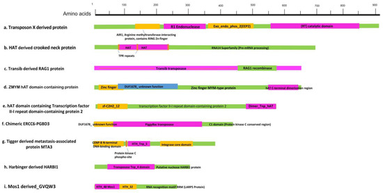 Transposase-derived proteins were analyzed and annotated using public annotation databases such Pfam, Swissprot, NCBI CD search [66,67], and Motif search online (www.genome.jp/tools/motif/) with default parameter (accessed on 20 February 2021). The figure was manually produced and labeled using PowerPoint.
