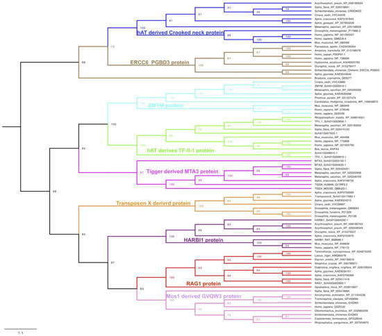 Phylogeny of the transposon-derived proteins retrieved from the genome of S. chinensis with other organisms retrieved from NCBI GenBank as a result of BlastP. Phylogenetic analysis of the sequences indicates their ancient domestications and can be found in insects to higher vertebrates. Clustering of the sequences derived from vertebrates, including humans with S. chinenis and other insects in the tree, represent their common origin. Each branch color in the tree represents a different group of transposon-derived proteins originating from the domestication of different TEs.