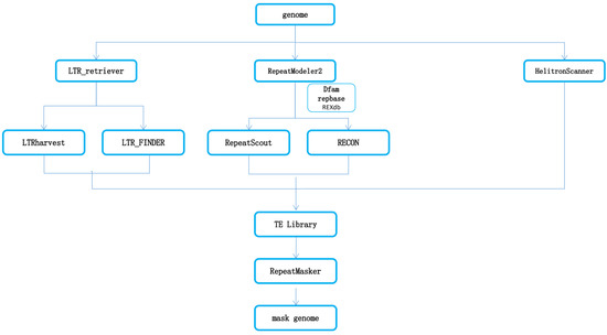 Transposable elements (TEs) were detected, identified, and annotated by combining homology-based and de novo approaches. Using RepeatModeler2, we first created a genome-wide de novo repeat library [53], which can run two de novo repeat searching scripts automatically, including RECON v1.08 [54] and RepeatScout [55]. Then, full-length long terminal repeat retrotransposons (LTR-RTs) were identified using LTRharvest with parameters (minlen: 100, maxlen: 40,000, mintsd: 4, maxtsd: 6, motif: TGCA, motifmis 1, similar 85, vic 10 -seed 20, seqids yes) and LTR_finder with parameters (D 40,000, d 100, L 9000, l 50, p 20, C -M 0.9) [56,57]. The high-quality intact LTR-RTs and non-redundant LTR library were then produced by LTR_retriever [58]. A non-redundant species-specific TE library was constructed by combining the de novo TE sequence library with the known Repbase v19.06, REXdb v3.0, and Dfam v3.2 databases [59,60,61]. Finally, TE sequences in the S. chinensis genome were identified and classified by homology search against the above libraries (Figure 7).