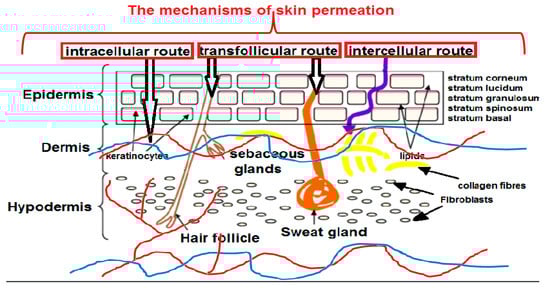 As for the process of penetration, the skin is a porous barrier in which there are numerous semi-circular channels of a diameter between 0.4 and 36.0 nm. The primary barrier that NPs must overcome is the SC. There are three possible ways of NPs’ penetration through the skin: through the lipid matrix of the SC, through the pores of sweat glands (diameter: 60–80 µm), or through hair follicles, pilosebaceous pores (diameter: 10–70 µm), and sebaceous glands.