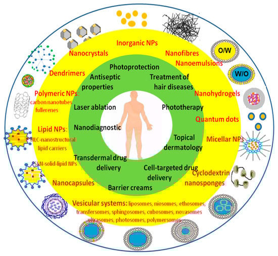 Many applications of nanoparticles have been described, not only in cosmetics but also in preparations for the treatment of skin diseases [19]. In nanomedicine, liposomal systems for transdermal drug delivery [20,21], contrast agents for diagnosing diseases, and gene therapies for cancer treatment have gained popularity [22,23,24,25,26].