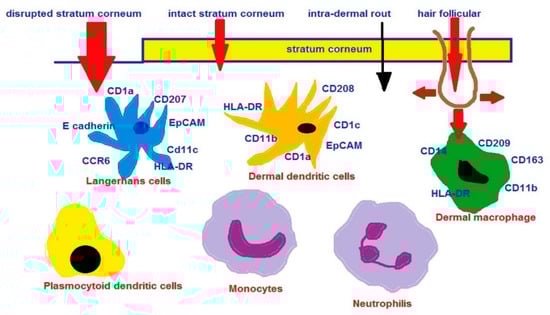 The skin contains a network of skin APCs, such as Langerhans cells (LCs), epidermis and dermal dendritic cells (DCs), dermal macrophages in the dermis, and other infiltrating cells, such as neutrophils, monocytes, inflammatory DCs (CD206+), and plasmocytoid DCs. The immune response is generated mainly by DCs and LCs, which are key regulators in the immune system [241,242,243]. For example, the skin is known to be responsible for sensitization to allergens [244,245,246]. Typical LCs are present in the suprabasal epidermis and rectal skin, foreskin, and body mucosa [247]. LCs are mainly recognized by the expression of the human leukocyte antigen (HLA)-DR and CD1a. Currently, the marker for LC identification is langerin [248]. CD1a+ cells are known to concentrate in the funnel epithelium of hair follicles [249]. NPs can easily accumulate in hair follicles, especially after mechanical stimulation [249,250]. The amount and depth to which the NPs penetrate along the alveolar duct depends on their size. However, it should be borne in mind that cleaning the hair follicle openings and reducing the barrier function in healthy skin has the potential to trigger an inflammatory response [251]. From the hair follicles, NPs diffuse into the perifollicular tissues and are taken up by LCs (CD207ţ) and dendritic cells (CD205ţ), which migrate to the lymph nodes [252,253].
