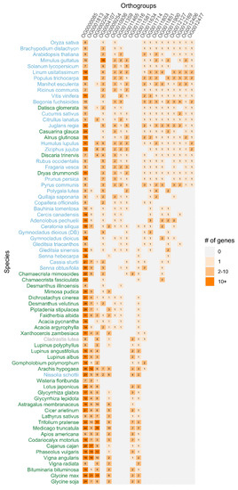 A total of 74 species were used in the OrthoFinder analysis (Supplementary Table S1), including two monocot species (Brachypodium distachyon and Oryza sativa ssp. japonica), which were included to provide a suitable outgroup. The individual datasets included both transcriptomes (newly reconstructed herein and reference data from the One Thousand Plant Transcriptome Initiative (2019)), as well as model genomes. Two independent transcriptomes, including one assembled in this study, were analyzed for G. dioicus. The capacity of each species to nodulate was determined from a consensus survey of five comprehensive phylogenetic studies and databases [13,18,25,26,27] (Supplementary Table S1).