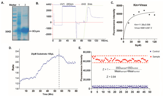 Establishing a high-throughput screening system with FRET assay. (A) SDS–PAGE analysis of the 3CLpro. Lane 1 represents the molecular mass markers, 35 kDa. Lane 2 shows the cell lysate, and lane 3 shows the 3CLpro with the tag, respectively. (B) Purification flow-through curve. (C) Measurements of kinetic parameters of the 3CLpro. (D) Dependence of the 3CLpro reaction rate on the reaction time. (E) Summary of statistical parameters to assess the robustness of the HTS assay.