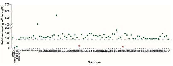 Results of the high-throughput screening. Twenty µM of the compounds was pre-incubated with 100 nM of SARS-CoV-2 3CLpro for 30 min at 30 °C, and then a 10 µM FRET substrate was added to the reaction mixture to initiate the reaction. The reaction was monitored for 2 h. The initial velocity was calculated by linear regression using the data points from the first 15 min of the reaction. The calculated initial velocity with each compound was normalized to DMSO control. The results are the average of three repeats. The asterisk indicates 29# contains a polyphenol P2 ligand, and 50# contains a caffeine P2 ligand.