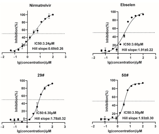 To verify the screening results, we further characterized the inhibitory activities of these hits against SARS-CoV-2 3CLpro in a dose-response experiment to determine their IC50 values. The FRET values were measured, and the inhibitory rates were calculated for the inhibitor treatments compared to the DMSO control, which was then plotted as dose-response curves for determining the inhibitor efficacies of the IC50 values. The results showed that nirmatrelvir and ebselen could dose-dependently inhibit the enzymatic activity of the 3CLpro with an IC50 value of 3.24 μM and 3.60 μM (Figure 3), which are comparable to the reported IC50 value. We also observed a gradual decrease in the cleavage efficacy of the 3CLpro under the treatment of our hits (29# and 50#) with an IC50 value of 6.30 μM and 3.50 μM, respectively. As a counter screen, we measured the activity of 29# and 50# against Cathepsin L, a member of the lysosomal cysteine protease [32]. The result showed that both the compounds exhibited a very limited inhibitory effect (Figure S1), providing evidence to support the specific activity of 29# and 50# against the 3CLpro.