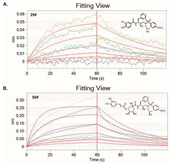 BLI assays for the binding of the hits to the 3CLpro protein in vitro. Both of the hits at different serially diluted concentrations were titrated into a fixed concentration of the labeled 3CLpro protein (100 nM). (A) The kinetic fitting curves for the interaction between 29# and 3CLpro protein was analyzed by BLI assay. Five different concentrations including 6.25, 12.5, 25, 50, and 100 µM were set. (B) The kinetic fitting curves for the interaction between 50# and 3CLpro protein was analyzed by BLI assay. Six different concentrations including 6.25, 12.5, 25, 50, 100 and 200 µM were set.