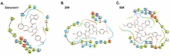 Predicted binding poses for darunavir (A) and its two derivatives (B,C). Residues within 5 Å of the compounds were shown on the 2D ligand interaction diagram. For clarity, only polar hydrogen atoms were shown. Here, the color code is that dark blue is positively charged, red is negatively charged, cyan is polar, and green is hydrophobic. Hydrogen bonding is depicted as the magenta arrows, π-cation interactions are depicted as the red line, and π–π interactions are depicted as the green line.