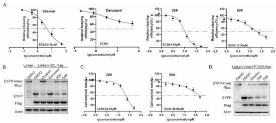 To further confirm and characterize the inhibitory activities of these hits against SARS-CoV-2 3CLpro at the cellular level, we performed a cell-based bioluminescence resonance energy transfer (BRET) assay, as previously described [33]. HEK293T cells were transfected with plasmids expressing pEYFP-linker-Rluc and SARS-CoV-2 3CLpro before being treated with increasing doses of the inhibitors. The BRET values were then measured, and the inhibitory rates were calculated for the inhibitor treatments compared to the DMSO control, which was then plotted as dose-response curves for determining the inhibitor efficacies of the EC50 values (Figure 6A). From the results, the EC50 values of the two hits ranged from 8.9 to 13.5 μM, with the positive control, ebselen, at 9.2 μM. Meanwhile, we also evaluated the cytotoxicity of the inhibitor hits using a Cell Counting Kit-8 (CCK-8) assay. The results show that the CC50 values of the two hits are higher than 24 μM (Figure 6C), which generally rules out the false positives due to significant cell toxicity. Ebselen has extremely low cytotoxicity (the median lethal dose in rats is >4600 mg kg−1 when taken orally), and darunavir is the latest protease inhibitor approved by the FDA; both are safe in humans and have been evaluated in a number of clinical trials [7,34]. It should be noted that the relatively low selectivity indexes of 29# and 50# suggest that their activity might be in part due to cytotoxicity; therefore, further optimization is clearly needed for future development.