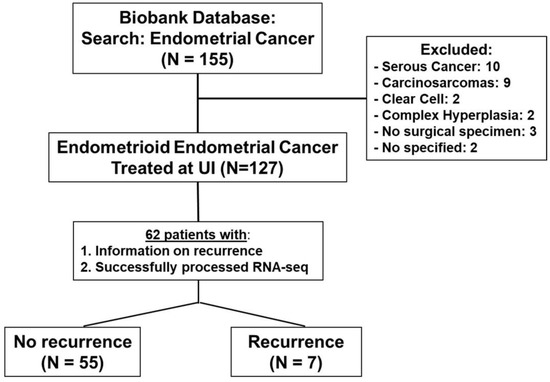 Flow of included patients in analysis. Of the initial 155 endometrial cancers available in the UI Biobank, 127 were confirmed to be of endometrioid histology. The rest were excluded from the study. A total of 62 patients had annotated follow-up with detailed recurrence information and with quality RNA for RNA sequencing (RNA-seq).