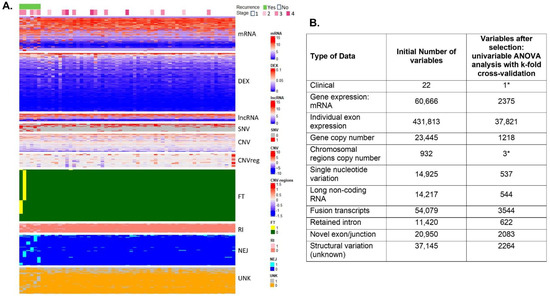 Included patients. (A) Heatmap of selected variables after univariate ANOVA analysis. Representation of the significant variables after univariate analysis (p < 0.05) for different types of genomic data. Recurrent cases are at the left side of the panel (under the light green bar); non-recurrent cases are at the right (white bar). Of the 22 clinical features introduced in the lasso analysis, only stage was informative for recurrence (upper part of the panel, color coded from 1 to 4). Transcriptome: DEX: exon expression; lncRNA: long non-coding RNA; Exp: gene expression. Genomic variation: SNV: single nucleotide variation; CNV: gene copy number by gene; CNVreg: copy number by chromosomal region; Structural variation: FT: Fusion transcripts; RI: Retained intron; NEJ: Novel exon/junction; U-SV: Unknown SV. At the right side of the panel are the labels and the color-coded range of values for all genomic variables. (B) Variable selection and variables after univariate analysis. To reduce the number of variables, we used univariate analysis of all data with ANOVA to select the variables that were more informative for prediction of response, with a p-value < 0.05 (3rd column). * Lasso regression was performed directly with no pre-reduction with ANOVA because the smaller number of variables in two types of data: clinical data and copy number by chromosomal region. Graphics were generated with R package ComplexHeatmap [21].