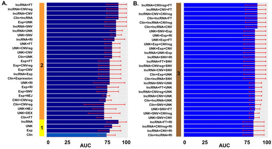 Performance of prediction models of EEC recurrence. (A) The solid vertical bar represents the number of types of data: 1 (yellow): only one variable was included in the model; 2 (orange): combination of two types of variables; (B) The solid vertical maroon bar represents the combination of three types of variables. Different performances on both panels are displayed in ascending order. The x axis is AUC as a percentage (0–100%). The red error mark displays the 95% confidence interval (CI). Overall, 72 models with different combinations of data were tested. We only displayed the best (A) 30 models for combinations of one and two variables and (B) 30 best models for combinations of three types of variables. Exp: gene expression; DEX: exon expression; lncRNA: long non-coding RNA; SNV: single nucleotide variation; CNV: gene copy number by gene; CNVreg: copy number by chromosomal region; FT: Fusion transcripts; RI: Retained intron; NEJ: Novel exon/junction; UNK: Unknown SV. Graphics were generated with R package ggplot.