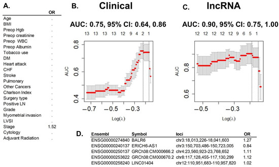 Best prediction model and comparison with clinical model. (A) The lasso multivariate regression model with clinical variables: out of the two clinical variables included in the model, only Stage remained as informative for prediction of EEC recurrence after the analysis, with an increased risk for recurrence as stage increases. (B) Graphic representation of the clinical lasso analysis: superior margin reflects number of variables; left margin reflects performance of the model measured in AUC (area under the curve); lower margin reflects lambda tunning parameter chose by cross-validation to optimize the model. The optimized AUC was 0.75 (95% CI: 0.68, 0.86), between the dotted lines. (C) Graphic representation of the lncRNA data lasso analysis (same margins and design as before): optimized AUC of 0.9 (95% CI: 0.75, 1.00). (D) The lasso multivariate regression model with lncRNA data: out of the 544 clinical variables included in the model, five single lncRNAs remained as informative for prediction of EEC recurrence. Four of them increased risk (OR > 1) and one protected from recurrence (OR < 1). Graphics were generated with R package glmnet.