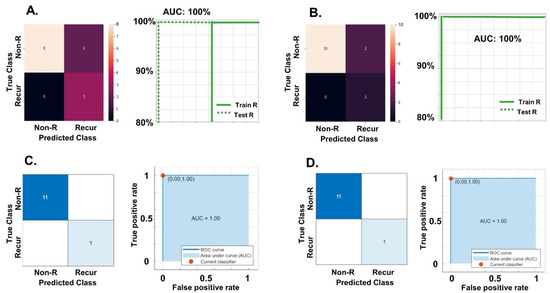 (A) Validation of the best model with lncRNA data and FIGO Stage clinical variable (the most informative in the clinical model). These are the results after training and validating the model with TensorFlow in 75% of the samples, and then performing testing on the remaining 25% of the data. We are showing the testing results. The left panel shows the confusion matrix representing the true (True Class) versus the predicted values (Predicted Class). The right panel is an ROC graphic: true positives in the x axis, false positives in the y axis, and AUC results. Train R: results of unbalanced (or re-sampling) model training; Test R: results of re-sampling model testing. AUC of 1.00 and accuracy of 0.92. Recur: recurrent; Non-R: non recurrent. (B) Validation of the best model with only lncRNA data and no clinical variables. As before, we are showing testing results in 25% of the data, after training and validating have been performed with TensorFlow. Left and right panels are as before. AUC of 1.00 and accuracy of 0.85. (C) Validation of the best model with lncRNA data and FIGO Stage clinical variable performed with MATLAB platform. We are showing testing results in 20% of the data, after training and validating have been performed. MATLAB offers over 30 methods for its machine learning (ML) App. In four of them the accuracy of testing was 100%, as shown in the graphic. Specifically, this is the coarse Gaussian SVM (support vector machines) method. Left and right panels are as before. AUC of 1.00 and accuracy of also of 1. (D) Validation of the best model with only lncRNA data and no clinical variables with MATLAB platform. Parameters are as before. This time, most methods had a testing accuracy of 100%. Showing the linear SVM method. Left and right panels are as before. AUC of 1.00 and accuracy of also of 1.