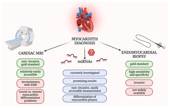 Comparison of methods used in myocarditis diagnosis and microRNAs’ advantages as potential diagnostic biomarkers. EMB—endomyocardial biopsy; miRNAs—micro-ribonucleic acids; MRI—magnetic resonance imaging.