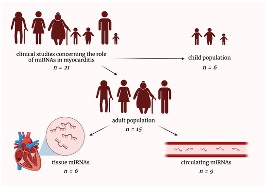 So far, few clinical studies investigating the role of microRNAs in myocarditis have been conducted. We searched PubMed Database and eventually included 21 original clinical research relevant to the discussed field. We have divided these studies into the following parts: (i) microRNAs in pediatric myocarditis patients, (ii) tissue microRNAs in adult myocarditis patients, and (iii) circulating microRNAs in adult myocarditis patients (Figure 2).