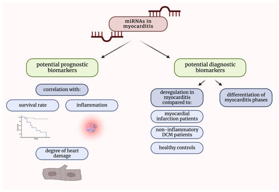Different clinical studies demonstrated that the levels of multiple miRNAs were significantly upregulated or downregulated in both serum and tissue derived from patients suffering from myocarditis. Furthermore, observed deregulation was usually correlated with the degree of heart damage, inflammation, or even survival rate, which suggested the putative prognostic role of the miRNAs’ measurements. Importantly, miRNA levels in patients suffering from myocarditis were different from those measured in patients with other cardiac diseases, such as myocardial infarction or non-inflammatory dilated cardiomyopathy, which makes them promising diagnostic biomarkers. It was also proved that particular miRNAs can be used to distinguish between different phases of myocarditis. It might be utilized to identify patients in the fulminant or acute phase of the disease, most often requiring even more intensive care (Figure 3).