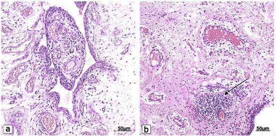 A representative image that depicts the histopathological features of low-grade synovitis in OA. (a) The synovial lining layer is slightly thickened, and the stromal density is slightly increased; few perivascular lymphocytes are evident. (b) The lining cells form 3–4 layers, the cellular density within synovial stroma is increased, and inflammatory infiltrate is present (arrow). Hematoxylin and eosin staining. Scale bars: 50 μm.