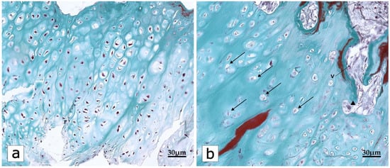 A representative image that depicts the OA-associated changes in Safranin O/Fast green stained section of articular cartilage. (a) Degradation of cartilage and changes in the proteoglycan content, as indicated by the lack of orange–red staining, is evident. (b) Enlarged, hypertrophic chondrocytes contain abundant cytoplasmic inclusions (arrows). Deep vascular invasions (V) into the cartilage matrix and reactive chondroclasts (arrowheads) are evident. Safranin O/Fast green staining. Scale bars: 30 μm.