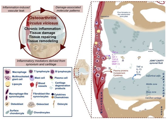 Nowadays, OA is recognized as a common, multifactorial musculoskeletal disease [,]. Cell senescence, metabolic dysfunction, inflammation, and traumatic injury have all been proposed to play a role in developing the disease [,,,]. The hallmark of the disease is the existence of an imbalance between the destruction and formation of articular cartilage [,,]. Due to changes in its molecular integrity, it is thought to begin with the structural decomposition of cartilage and subsequent increased susceptibility to trauma []. Trauma to the cartilage causes a release of damage-associated molecular patterns (DAMPs) into the synovial fluid and triggers an innate immune response from synovial cells. [] The synovial cells produce inflammatory cytokines and DAMPs, thus recruiting other cells of the entire joint and causing a pro-inflammatory response []. Chondrocytes become hypertrophic and generate extracellular matrix-degrading enzymes such as matrix metalloproteinases (MMPs) and pro-inflammatory mediators in an attempt to reverse the damage to the cartilage (Figure 2), thus tipping the homeostatic balance to the side of catabolism []. Gradually, chondrocytes undergo structural and secretory pattern changes, as well as apoptosis [,]. Thereafter, cavities in degrading cartilage and subchondral bone created by dying apoptotic cells are invaded by blood vessels, thus establishing an avenue for inflammatory cells []. Immune cells release cytotoxic molecules that, together with the extracellular-matrix degrading enzymes, lead to the damage of joint tissues, subsequently causing a release of DAMPs, thus closing a feedback loop of the vicious circle (Figure 3) [,].