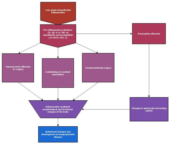 The existence of putative bidirectional communication between the brain and organ systems, including the musculoskeletal, has been proposed [,,,]. Virtually every somatic disease presents with inflammation at some point in its pathogenesis. There is a clear trend of coupling diseases with a strong inflammatory component with behavioral changes and mental disorders [,,]. The crosstalk between peripheral inflammation and the Central Nervous System (CNS) is evidenced in neurological and psychiatric sequelae associated with chronic inflammatory joint diseases like rheumatoid arthritis (RA) []. The neurological manifestations of RA are usually uncommon, but the burden of cognitive impairment in RA can be significant [,,]. Currently, the mechanisms that are utilized by the body to instantiate changes in behavior are not completely understood. There is also no clear-cut threshold of inflammatory process intensity beyond which it becomes pathological, behavioral changes occur, and a neuropsychiatric disease develops. Though the link is most evident in highly inflammatory and autoimmune diseases such as systemic lupus erythematosus, RA, and ulcerative colitis, evidence is substantially lacking in cases presented with low-grade chronic inflammation, not in the least because the hypothetical influence is temporarily spread out [,,,].