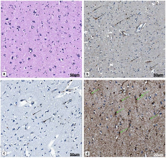 The structural appearance of the inferior parietal lobule of OA patient, post-mortem bran tissue. (a) An overview of the lobe as observed by the use of routine staining; (b) The interface of the gray and white matter presents with brown coloration in the cell bodies and moss-like processes of microglial cells (arrows), Iba1 immunohistochemistry; (c) Microglial cells (arrows) visualized by the presence of brown reaction products confirmed by the use of an anti-CD68 antibody, CD68 immunohistochemistry; (d) Astrocytes (arrows) that demonstrate strong expression of the glial fibrillary acidic protein (GFAP), GFAP immunohistochemistry. Scale bars: (a–c) 50 μm; (d) 30 μm.