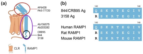 Seven anti-RAMP1 antibodies were used, as detailed in Table S2. For blocking peptide experiments, a peptide corresponding to the human RAMP1 C-terminal sequence was synthesized in-house (Figures S19–S21) and primary antibodies (844 and ab156575) were pre-incubated with 50 µM peptide for 1 h at 20 °C. The primary antibody antigens, where known, and species-specific sequence information, are shown in Figure 1 and Figure S15. The secondary antibodies used are detailed in Table S5. An anti-myc or anti-FLAG tag antibody was used as a control for some experiments (Figure S2).