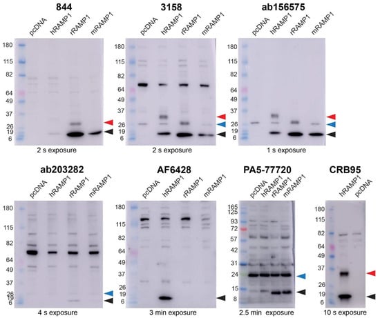 Immunoblotting of transfected cell preparations with anti-RAMP1 antibodies. Membrane-enriched protein samples were prepared from HEK293S cells transfected with hCLR:myc-hRAMP1, rCLR:rRAMP1, mCLR:mRAMP1 or vector. Blots were probed with 844 (5 µg/mL), 3158 (1:200), ab156575 (0.612 µg/mL), ab203282 (1 µg/mL), AF6428 (1 µg/mL), PA5-77720 (0.85 µg/mL) or CRB95 (2 µg/mL) primary antibody. Exposure time is indicated under each blot. Blots are representative of three independent experiments using the Benchmark protein ladder with MOPS buffer, except PA5-77720 which used MES buffer and the Abcam protein ladder. Note that, using these methods, the Benchmark protein ladder over-estimates molecular weights (see Figure S2). Black-filled arrowheads indicate the predicted monomeric RAMP1 band; red-filled arrowheads indicate likely RAMP1 dimers; blue-filled arrowheads mark the non-specific ~24 kDa band described in the text.
