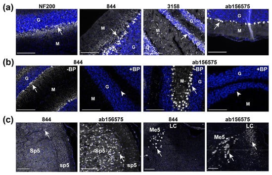 Neurofilament and RAMP1-like immunoreactivity in rat brain structures. (a) Immunoreactivity of NF200 (2.72 µg/mL), 844 (10 µg/mL), 3158 (1:200) and ab156575 (3.06 µg/mL) in rat cerebellum. (b) Immunoreactivity of 844 (10 µg/mL) and ab156575 (3.06 µg/mL) in the presence or absence of 50 µM blocking peptide (BP). (c) Immunoreactivity of anti-RAMP1 antibodies 844 (10 µg/mL) and ab156575 (3.06 µg/mL) in rat spinal trigeminal nucleus (Sp5), spinal tract of the trigeminal nerve (sp5), and locus coeruleus (LC). Anti-RAMP1 immunoreactivity is shown in greyscale and nuclear staining in blue. White arrows indicate positive immunoreactivity. White arrowheads indicate regions where immunoreactivity was absent. Scale bars represent 200 µm. (a) Images are representative of immunoreactivity detected in three individual rats. (b) Images are representative of immunoreactivity detected in three individual rats. (c) Sp5 images are representative of immunoreactivity detected in three (ab156575) or five (844) individual rats. LC images are representative of immunoreactivity detected in three (ab156575) or four (844) individual rats. Heat-induced epitope retrieval (HIER) was performed for ab156575. G = granular layer, M = molecular layer.
