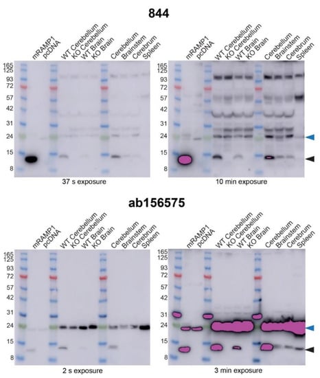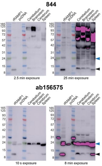 Both 844 and ab156575 produced bands at ~14 kDa in lanes containing samples prepared from rat spleen or cells transfected with rRAMP1, consistent with the molecular weight of monomeric RAMP1 (Figure 5 and Figure S11) and similar to previous Western blots (Figure 2). For the transfected cells, the likely rRAMP1 dimer was present at ~24 kDa, along with the non-specific band for ab156575 at a similar apparent molecular weight, similar to previous blots (Figure 2). In samples prepared from rat brain, both antibodies detected a band at approximately the molecular weight of monomeric RAMP1, though the position of this corresponded with a slightly higher apparent molecular weight. This could mean that in brain tissue, a variant of RAMP1 is being detected, it has one or more post-translational modifications, or this is not actually RAMP1. For 844, a band consistent with a RAMP1 dimer could not be clearly distinguished in the tissue preparations because there were many bands detected. These additional bands were particularly intense at ~57 kDa and above, but ranged across the blots and were clearly visible with the extended exposure time. ab156575 produced fewer additional bands but the non-specific band at ~24 kDa confounded the ability to determine whether a RAMP1 dimer was present in rat brain and spleen preparations. Prolonged exposure revealed that blots probed with ab156575 cross-reacted with proteins in the Abcam ladder (Figure 5 and Figure S11).