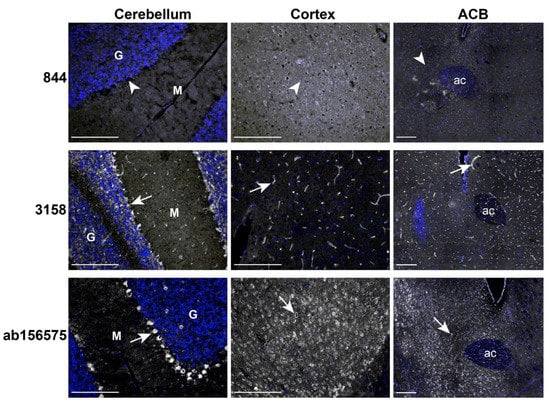 RAMP1-like immunoreactivity in mouse cerebellum, cortex and nucleus accumbens (ACB). Immunoreactivity of 844 (10 µg/mL, 3158 (1:200) and ab156575 (3.06 µg/mL) in the cerebellum, cortex, and ACB of C57BL/6J mice (NZ colony). Anti-RAMP1 immunoreactivity is shown in greyscale and nuclear staining in blue. White arrows indicate examples of positive immunoreactivity. White arrowheads indicate regions where immunoreactivity was absent. Scale bars represent 200 µm. Images are representative of immunoreactivity detected in four individual mice. HIER was performed for ab156575. G = granular, M = molecular. ac = anterior commissure.