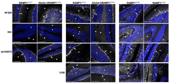 Neurofilament and RAMP1-like immunoreactivity in wildtype (WT) and hRAMP1 over-expression and knockout (KO) mouse cerebellum. Immunoreactivity of NF200 (2.72 µg/mL), 844 (10 µg/mL), ab156575 (3.06 µg/mL) and 3158 (1:200) is shown in greyscale and nuclear staining in blue. White arrows indicate examples of positive immunoreactivity. White arrowheads indicate regions where immunoreactivity was absent. Experiments with transgenic or KO mouse tissue were conducted in parallel with matched WT controls. Images are presented with the fluorescence intensity matched between the WT and transgenic or KO mouse for each antibody. Scale bar, 200 µm. Images are representative of staining detected in one (RAMP1KO/KO) or three individual mice (Nestin-hRAMP1 and Global-hRAMP1). HIER was performed for ab156575. G = granular, M = molecular.
