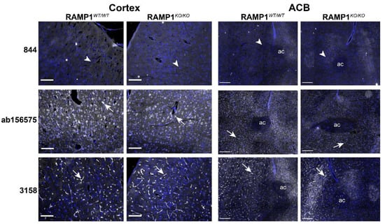 RAMP1-like immunoreactivity in WT and RAMP1 KO mouse ACB and cortex. Immunoreactivity of 844 (10 µg/mL), ab156575 (3.06 µg/mL) and 3158 (1:200) is shown in greyscale and nuclear staining in blue. White arrows indicate examples of positive immunoreactivity. White arrowheads indicate regions where immunoreactivity was absent. Scale bar, 100 µm (cortex), 200 µm (ACB). Images are representative of staining detected in three individual mice. HIER was performed for ab156575. ac = anterior commissure.