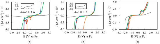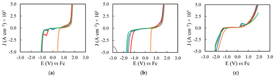 - O’Mahony, A.M.; Silvester, D.S.; Aldous, L.; Hardacre, C.; Compton, R.G. Effect of Water on the Electrochemical Window and Potential Limits of Room-Temperature Ionic Liquids. J. Chem. Eng. Data 2008, 53, 2884–2891. [Google Scholar] [CrossRef]