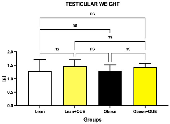 Testicular weight of the control and experimental groups. Data are presented as mean ± standard deviation. Lean–ZDF lean controls, Lean + QUE–ZDF lean rats supplemented with QUE, Obese–ZDF obese controls, Obese + QUE–ZDF obese rats supplemented with QUE. ns—non-significant.
