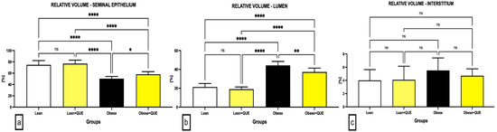Relative volume of (a) the seminal epithelium, (b) lumen, and (c) interstitium assessed in the testicular tissue of the pre-established control and experimental groups of ZDF rats. Data are presented as mean ± standard deviation. Lean–ZDF lean controls (n = 8), Lean + QUE–ZDF lean rats supplemented with QUE (n = 9), Obese–ZDF obese controls (n = 13), and Obese + QUE–ZDF obese rats supplemented with QUE (n = 14). * p < 0.05, ** p < 0.01, **** p < 0.0001, ns—non-significant.