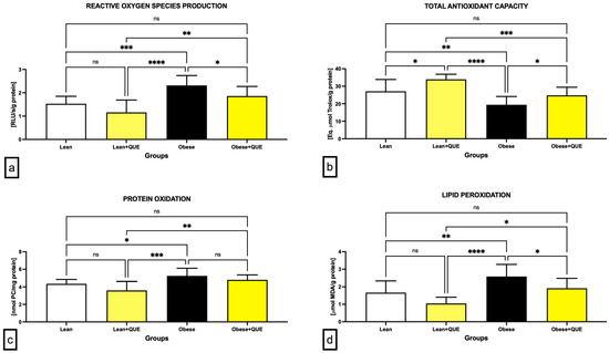 Similarly to protein oxidation, significantly higher levels of malondialdehyde (MDA) as the primary marker of lipid peroxidation (LPO) were detected in the Obese control (p < 0.01; Figure 5d). While QUE supplementation to Lean animals led to a non-significant decrease in MDA, significantly reduced MDA levels were observed in Obese animals in comparison to their controls (p < 0.05).