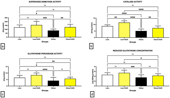Antioxidant characteristics of the testicular tissue including (a) superoxide dismutase activity, (b) catalase activity, (c) glutathione peroxidase activity, and (d) concentration of reduced glutathione in the pre-established control and experimental groups of ZDF rats. Data are presented as mean ± standard deviation. Lean–ZDF lean controls (n = 8), Lean + QUE–ZDF lean rats supplemented with QUE (n = 9), Obese–ZDF obese controls (n = 13), and Obese + QUE–ZDF obese rats supplemented with QUE (n = 14). * p < 0.05, ** p < 0.01, *** p < 0.001, **** p < 0.0001, ns—non-significant.