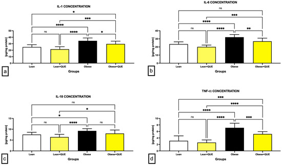 Levels of (a) interleukin-1 (IL-1), (b) interleukin-6 (IL-6), (c) interleukin-18 (IL-18), and (d) tumor necrosis factor alpha (TNF-α) in the testicular tissue collected from the pre-established control and experimental groups of ZDF rats. Data are presented as mean ± standard deviation. Lean–ZDF lean controls (n = 8), Lean + QUE–ZDF lean rats supplemented with QUE (n = 9), Obese–ZDF obese controls (n = 13), and Obese + QUE–ZDF obese rats supplemented with QUE (n = 14). * p < 0.05, ** p < 0.01, *** p < 0.001, **** p < 0.0001, ns—non-significant.