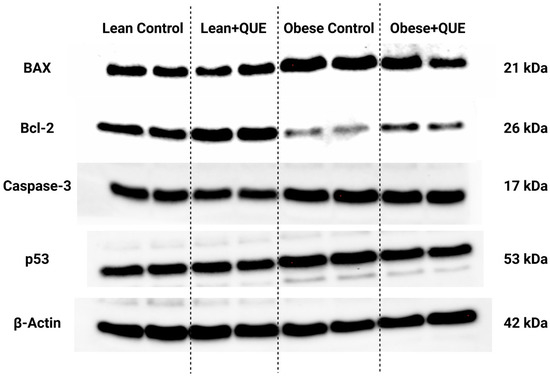 Expression patterns of the BAX, Bcl-2, caspase-3, and p53 protein in the pre-established control and experimental groups of ZDF rats. Data are presented as mean ± standard deviation. Lean–ZDF lean controls (n = 8), Lean + QUE–ZDF lean rats supplemented with QUE (n = 9), Obese–ZDF obese controls (n = 13), and Obese + QUE–ZDF obese rats supplemented with QUE (n = 14). The proteins were separated on 4–15% Mini-PROTEAN TGX Stain-Free Protein Gels (BioRad, Hercules, CA, USA). The loading uniformity was confirmed prior to the blotting procedure using the ChemiDoc Imaging System (BioRad, BioRad, Hercules, CA, USA). Respective bands were visualized using appropriate antibodies and ECL-based chemiluminescence. Precision Plus Protein marker (BioRad, Hercules, CA, USA) was used on each gel to indicate the molecular weight of the separated proteins. Original photos are available as Supplementary Material. Created with (supplementary: Confirmation of Publication and Licensing Rights) BioRender.com (accessed on 12 November 2022).
