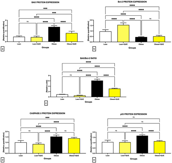 Graphical representation of the relative quantification of the (a) BAX, (b) Bcl-2, (d) caspase-3, and (e) p53 protein expression, as well as the BAX/Bcl-2 ratio (c) in the pre-established control and experimental groups of ZDF rats. Data are presented as mean ± standard deviation. Lean–ZDF lean controls (n = 8), Lean + QUE–ZDF lean rats supplemented with QUE (n = 9), Obese–ZDF obese controls (n = 13), and Obese + QUE–ZDF obese rats supplemented with QUE (n = 14). *** p < 0.001, **** p < 0.0001, ns—non-significant.