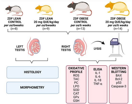 This study aimed to investigate the effects of QUE supplementation on the architecture and biochemical profile of testicular tissue collected from ZDF rats, with a special emphasis on selected oxidative, apoptotic, and inflammatory markers which have been suggested to be involved in male subfertility associated with Type 2 DM.