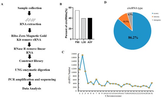 Identification of circRNAs of sheep longissimus dorsi muscle. (A) The workflow of circRNA analysis of skeletal muscle using RNA-seq method. (B) Proportion of circRNAs in each stage. (C) The distribution of circRNA on the chromosomes. (D) The type of the circRNA.