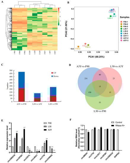 Analysis of differentially expressed circRNAs in sheep longissimus dorsi muscle. (A) Heatmap showing the expression dynamics of circRNAs in F90, L30, and A3Y. (B) PCA analysis. (C) DEcircRNA numbers. (D) DEcircRNA Venn diagram. (E) Validation of circRNA expression in sheep skeletal muscle by RT-qPCR. (F) Expression of circRNAs analyzed in RNA samples treated with both RNase R (–) and RNase R (+). We considered p < 0.05 to be statistically significant. * p < 0.05, ** p < 0.01.