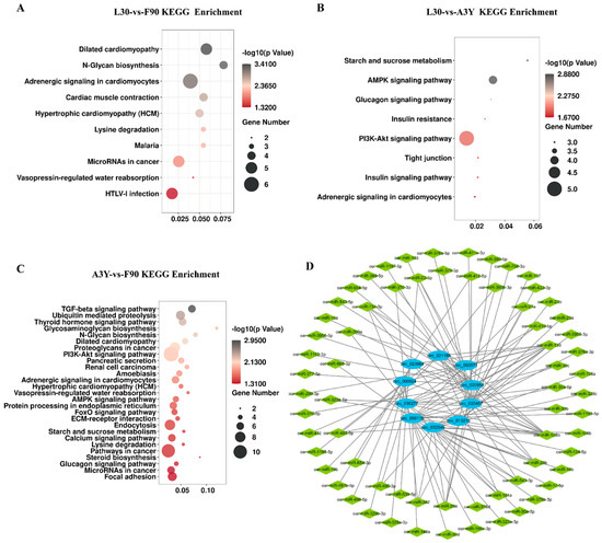 Kyoto Encyclopedia of Genes and Genomes pathways. (A) L30 vs. F90, (B) A3Y vs. F90, (C) L30 vs. A3Y. (D) Regulatory networks of circRNAs–miRNAs.