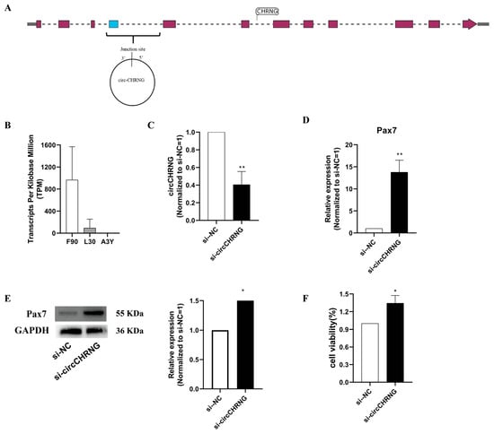 Knockdown of circCHRNG promoted the proliferation of ovine skeletal muscle satellite cells (SMSCs). (A) circCHRNG. (B) The expression level of circCHRNG in skeletal muscle from F90 to A3Y. (C) siRNA of circCHRNG decreased the expression level of circCHRNG. (D) Inhibition of circCHRNG increased the mRNA expression level of PAX7. (E) Inhibition of circCHRNG increased the protein expression level of PAX7. (F) MTT assays for vine skeletal satellite cells transfected with si-circCHRNG or si-NC. p < 0.05 was considered to be statistically significant. * p < 0.05, ** p < 0.01.