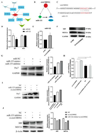 CircRNA–miRNA–mRNA Regulatory Circuitry. (A) Interaction network of circCHRNG and miRNAs. (B) Illustration of predicted circuitry including miR-133, circCHRNG, and SRF. The red node represents circRNAs; green node represents miRNA; blue node represents key genes related to myogenesis; the solid line represents the real regulatory effect; the dashed line represents the predicted regulatory effect. (C) The potential binding sites of miR-133 in circCHRNG. (D) circCHRNG wild-type (WT) or mutant (MUT) luciferase reporters and miR-133 mimics, or mimic negative control (NC), were co-transfected in 293T cells. (E) Expression of miR-133 in ovine SMSCs transfected with si-NC and si-circCHRNG. (F) Protein expression of SRF and MEF2A in ovine SMSCs transfected with si-NC and si-circCHRNG. (G) Expression of PAX7 protein in ovine SMSCs infected with miR-NC miR-133 mimics and miR-133 inhibitor. (H) MTT assays for ovine SMSCs co-transfected with si-circCHRNG and miR-133 inhibitor or miR-NC. (I) Expression of PAX7 protein in ovine SMSCs co-transfected with si-circCHRNG and miR-133 inhibitor or miR-NC. (J) Expression of SRF and MEF2A protein in sheep SMSCs co-transfected with miR-133 inhibitor and si-circCHRNG or si-NC. We considered p < 0.05 to be statistically significant. * p < 0.05, ** p < 0.01.